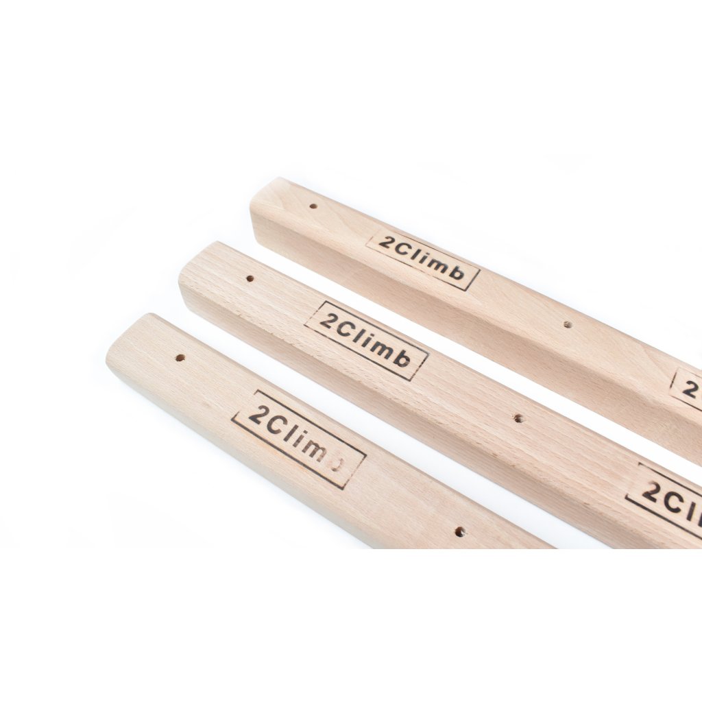 A jak takový Campus board vypadá? Jedná se o desku, nakloněnou pod úhlem 10 až 20 stupňů, na které jsou umístěny jednotlivé lišty. My lišty vyrábíme z bukového dřeva a nabízíme je ve třech variantách – 35 mm, 29 mm a 22 mm. Lišty mají délku 41 cm. První lišta by měla být umístěna zhruba metr a půl nad zemí a horní okraje jednotlivých lišt by od sebe měly být vzdálené zhruba 20 cm. Trénink probíhá tak, že se po těchto lištách (zpravidla) bez použití nohou pohybuješ nahoru a dolů, čímž trénuješ v podstatě vše, co se ti při lezení může hodit. Pokud nemáš k dispozici nakloněnou desku, je možné lišty navrtat i do kolmé zdi a trénovat na nich alespoň visy.
