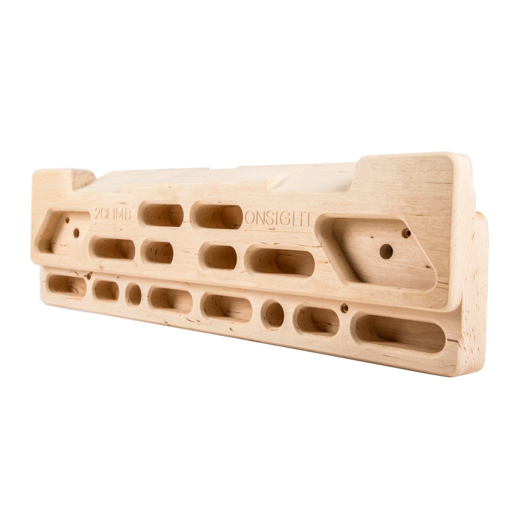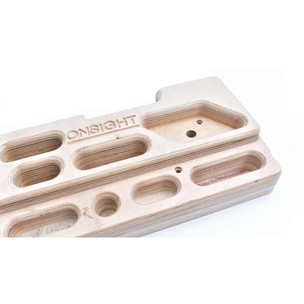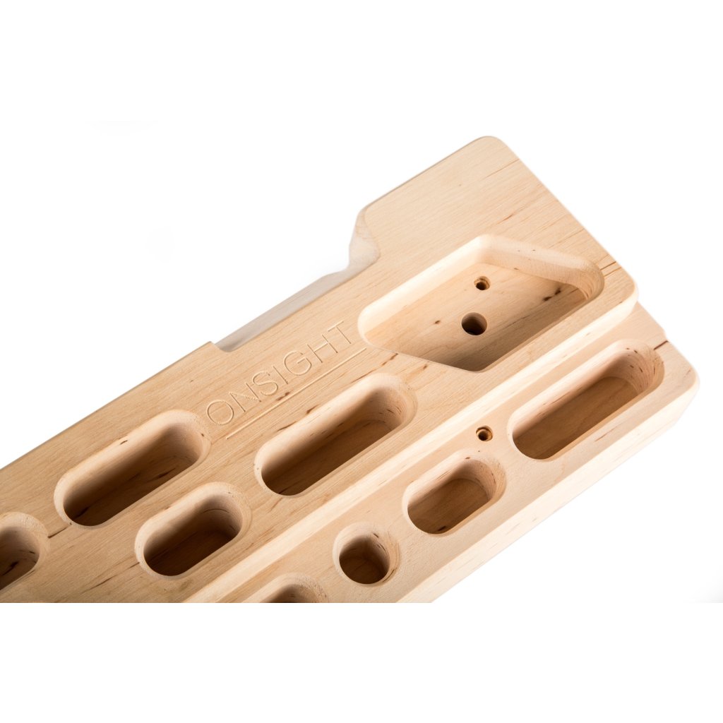 Onsight je deska, kterou vyrábíme z olšového masivu nebo březového kompozitu. Oba tyto materiály se vyznačují vysokou šetrností k pokožce a zabraňují jejímu poškození během tréninku. Hlavní předností olše je její vzhled, výhodou kompozitu může být naopak větší odolnost a také to, že v podstatě neklouže. V současnosti je v prodeji již druhý model tohoto hangboardu. Oproti původní verzi přibyl schůdek, díky kterému je možné pohodlně cvičit i na horních řadách, aniž by se ti ruce opíraly o spodní řady a snižovaly tak komfort z tréninku. Další novinkou je možnost přidělat si k hangboardu i magnetický stojánek na telefon, ten sice není součástí balení, je ale možné si ho kdykoliv dokoupit. Balkna je navržená i pro méně pokročilé lezce a proto se na ní nachází větší množství relativně pohodlných chytů: